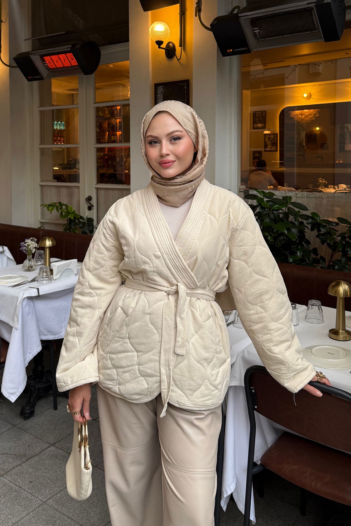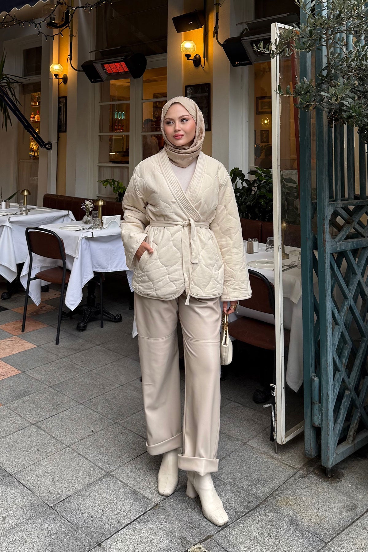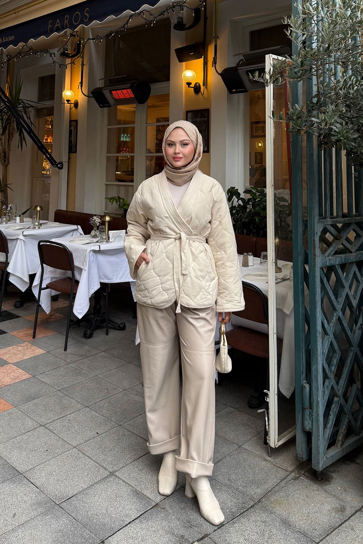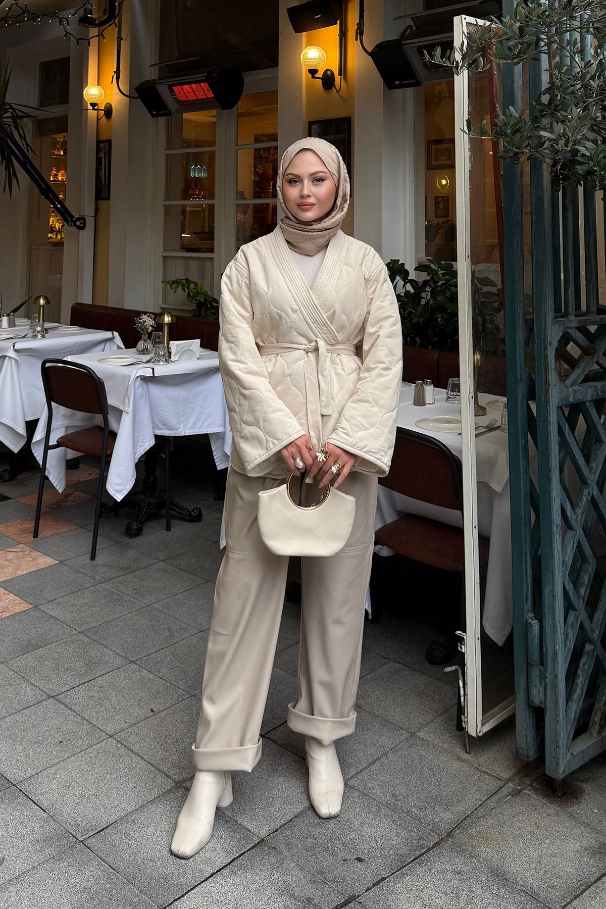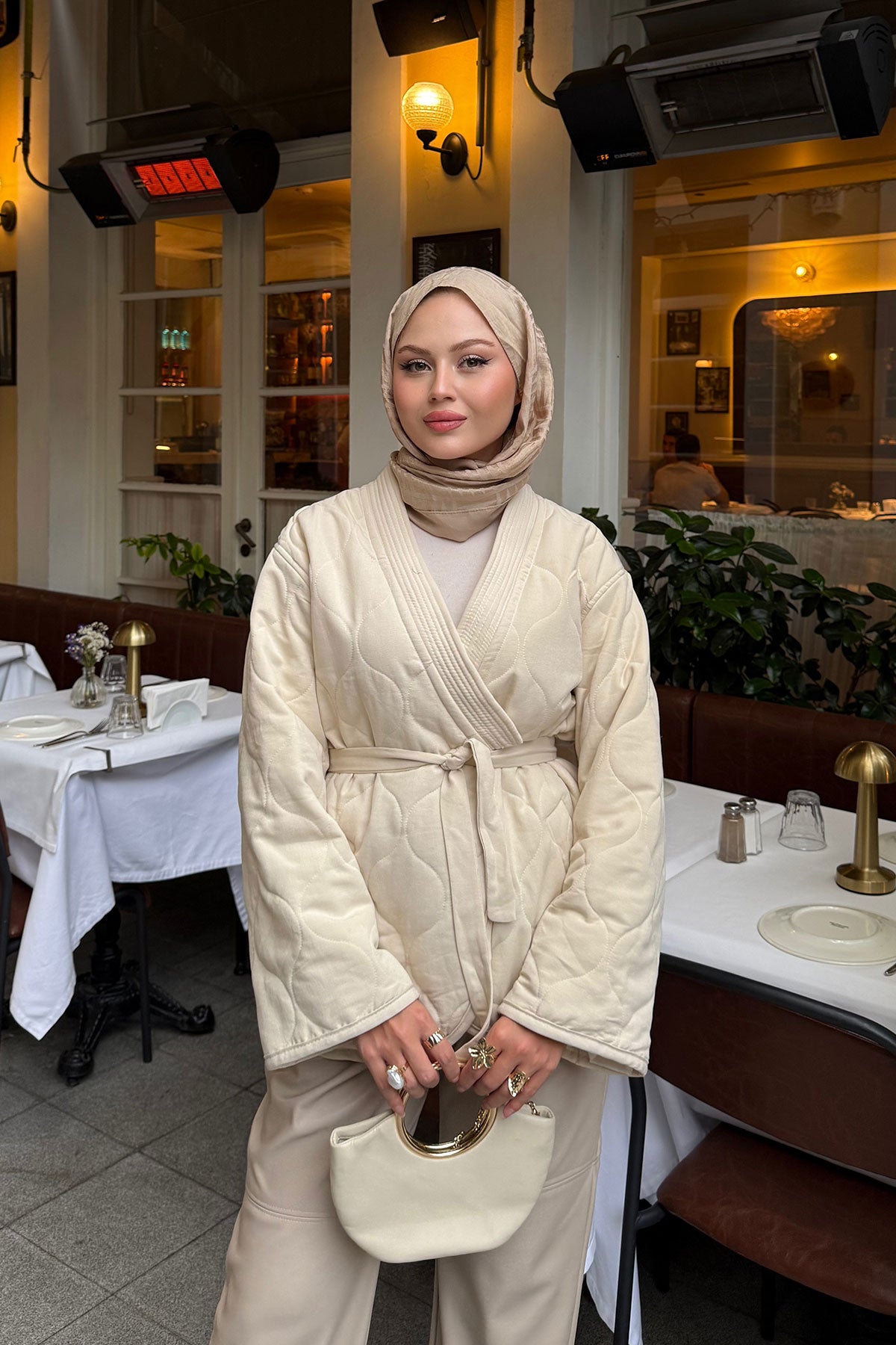 Nakış Desenli Bel Bağlamalı Ceket Krem