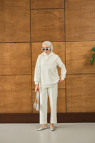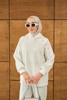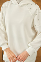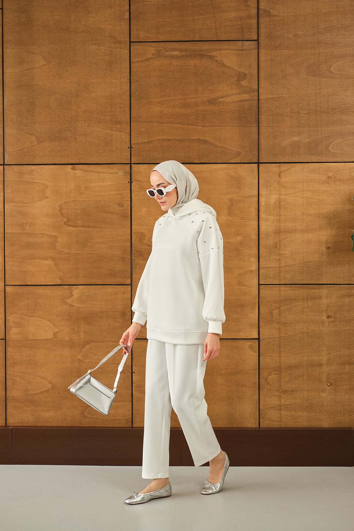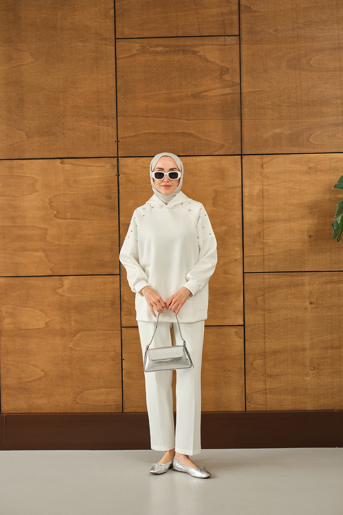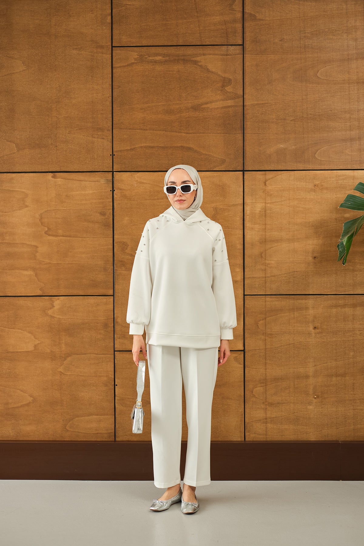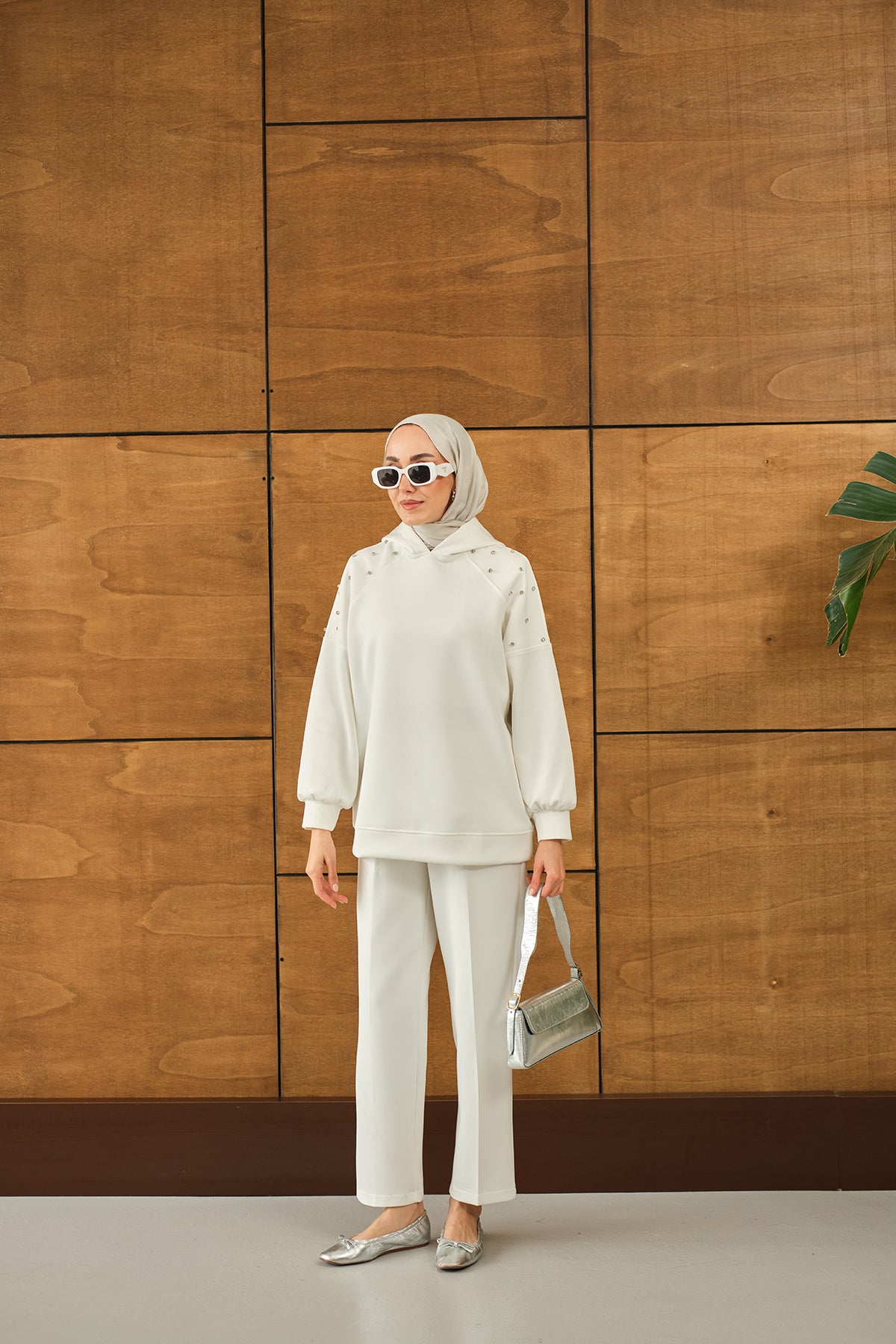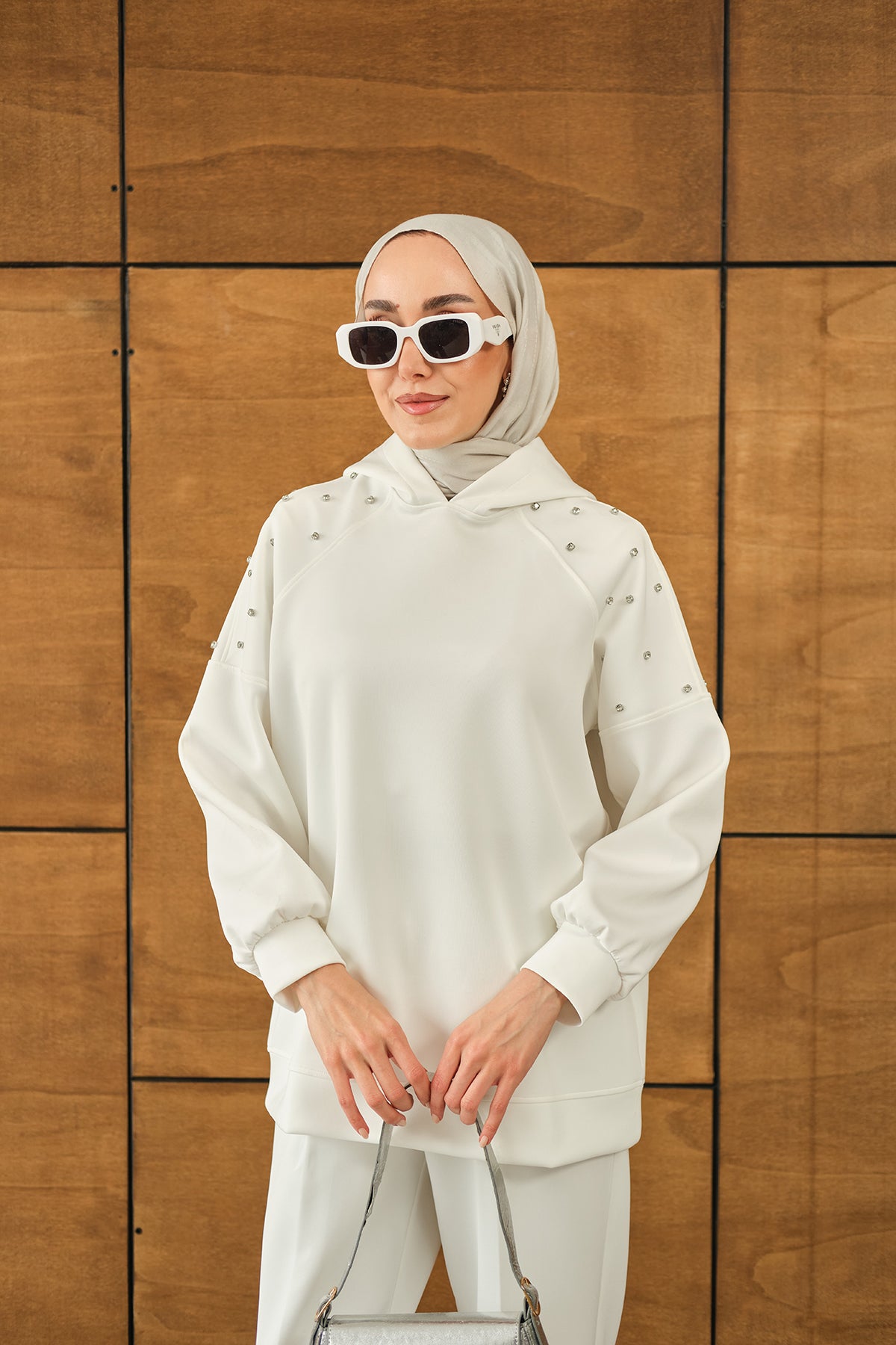 Omuz Taş Detay Kapüşonlu Takım Beyaz