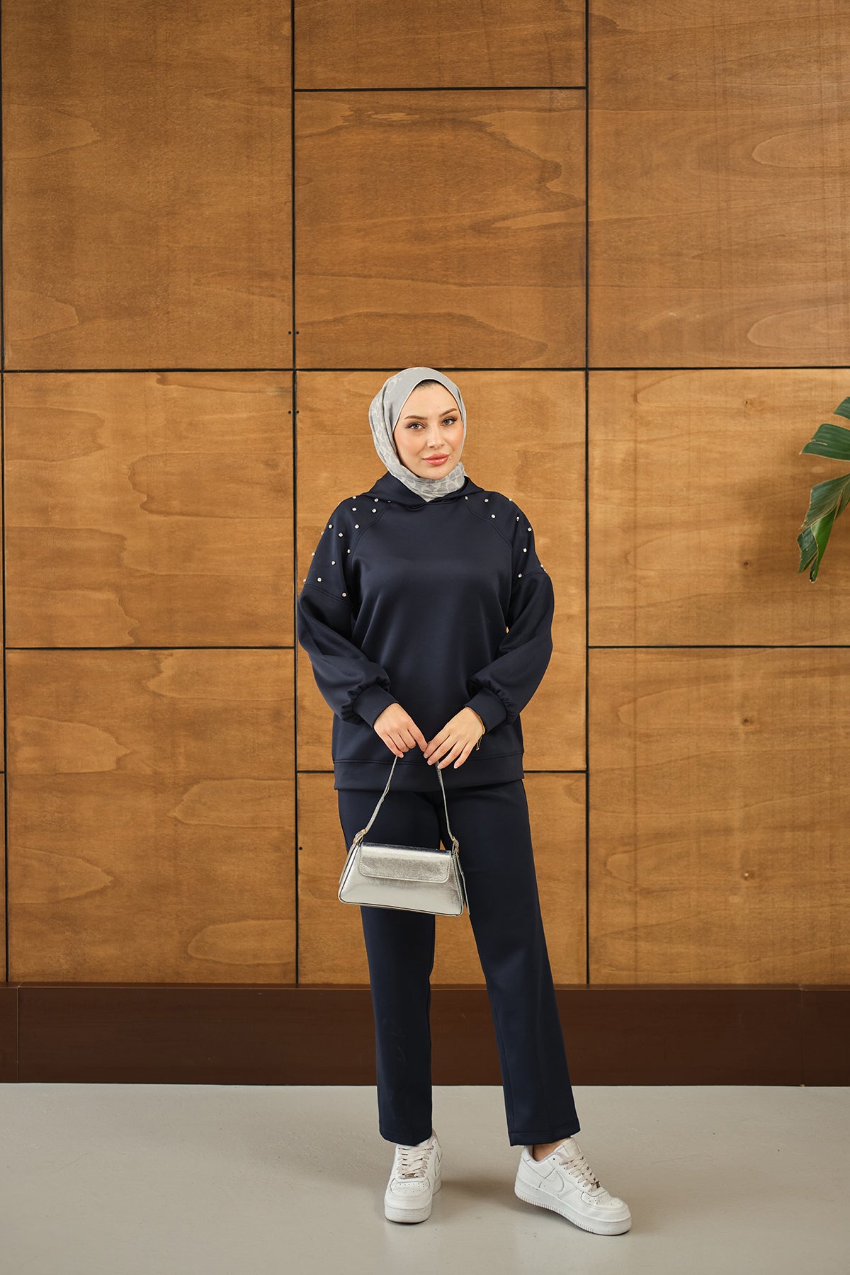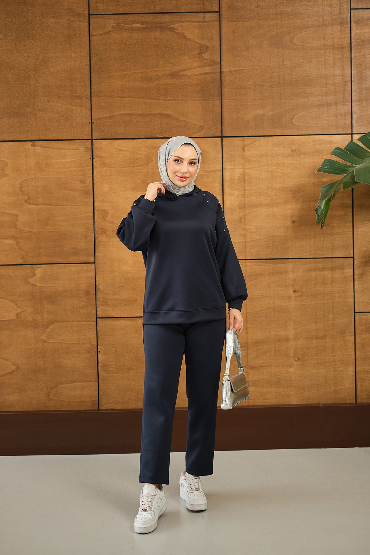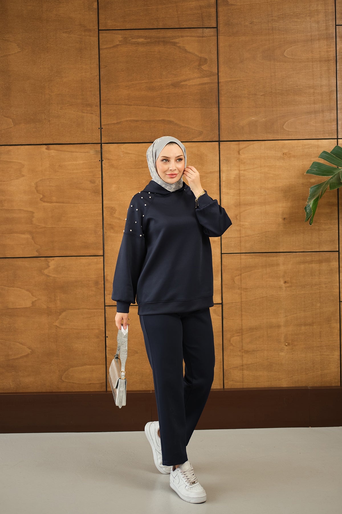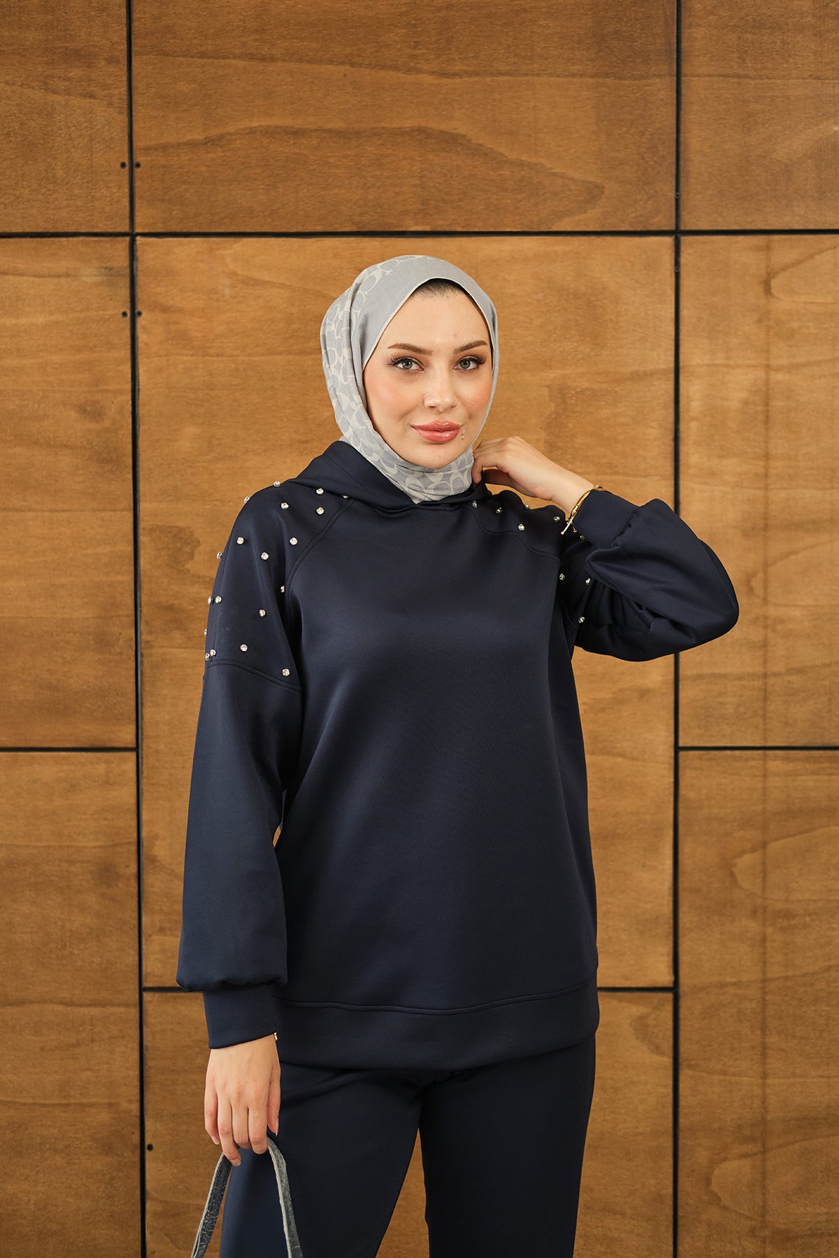 Omuz Taş Detay Kapüşonlu Takım Lacivert