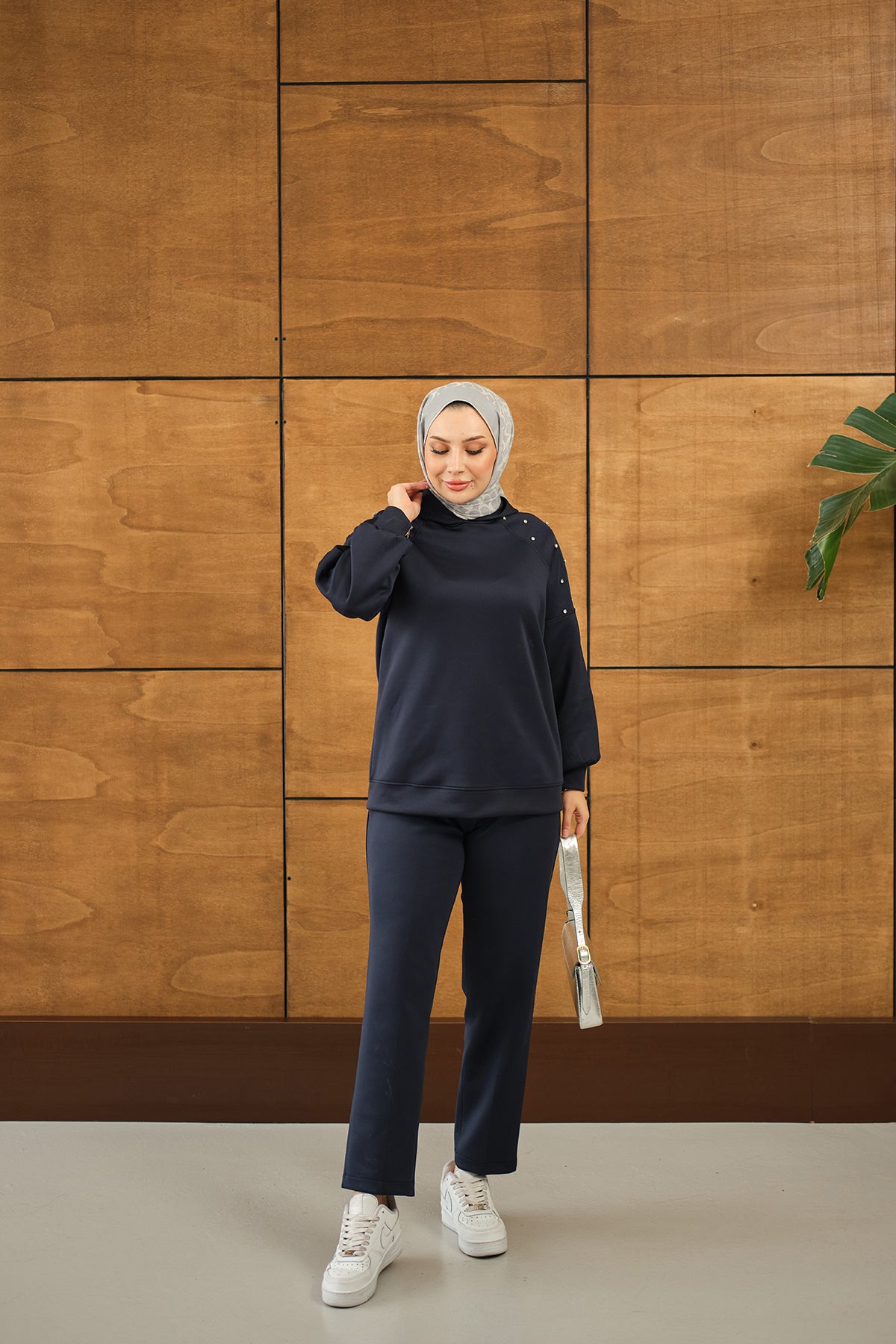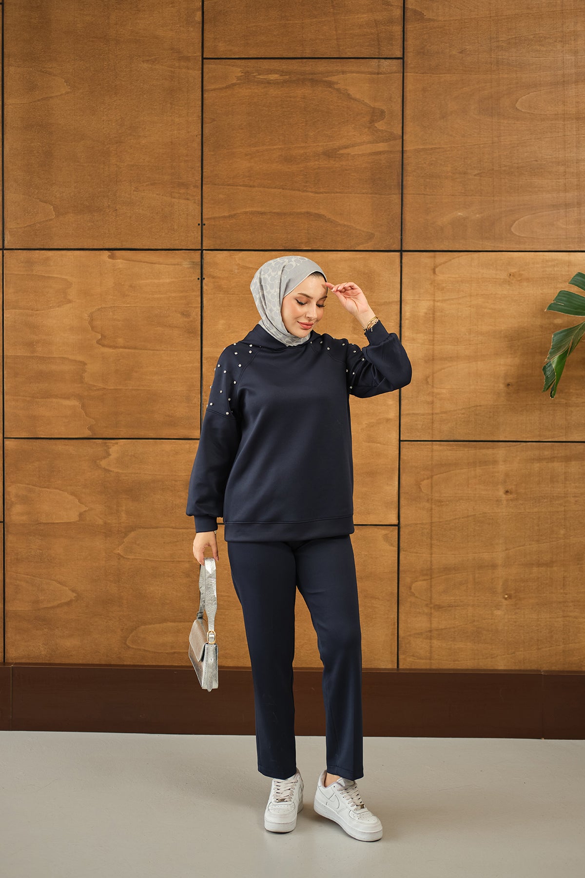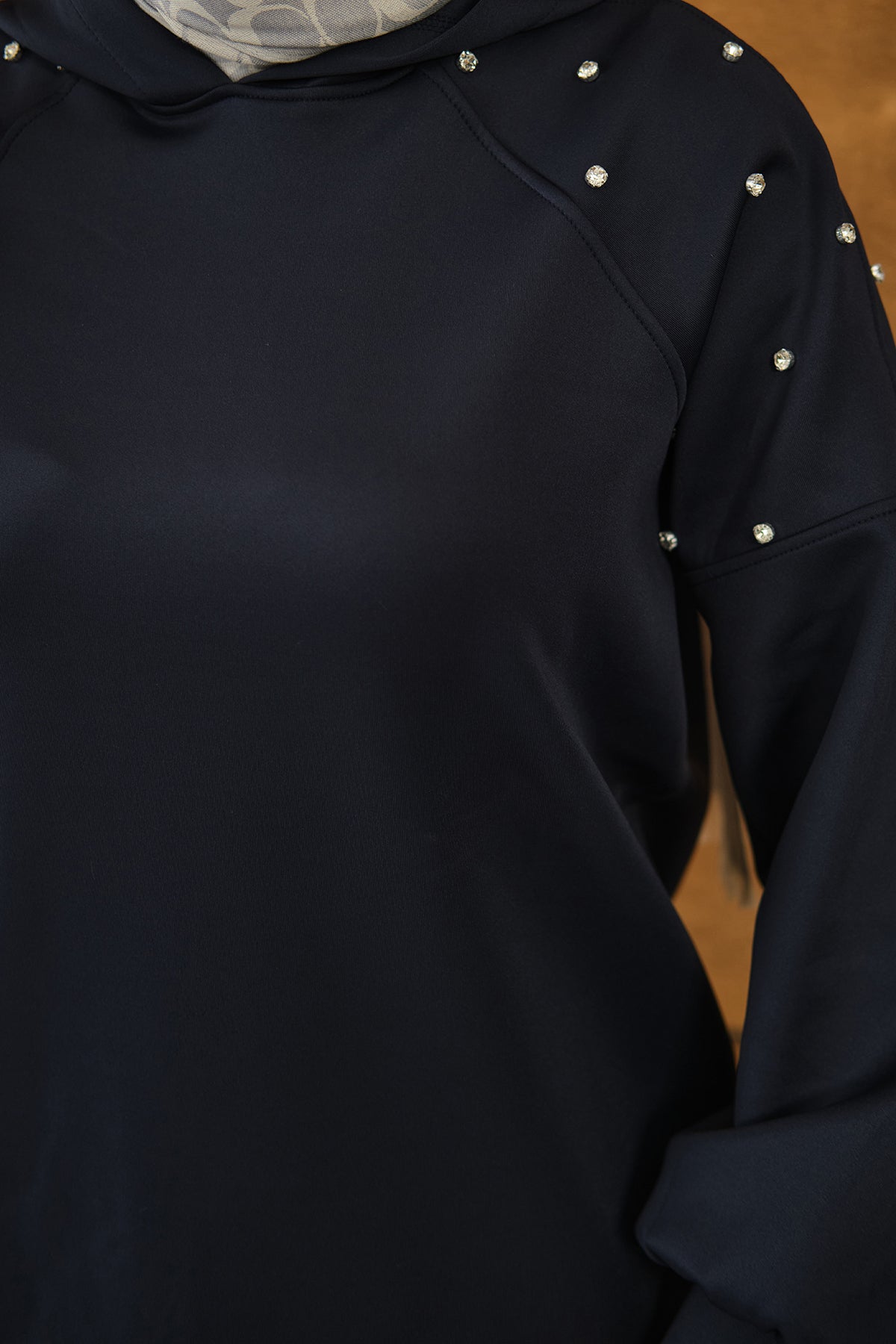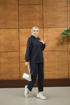 Omuz Taş Detay Kapüşonlu Takım Lacivert