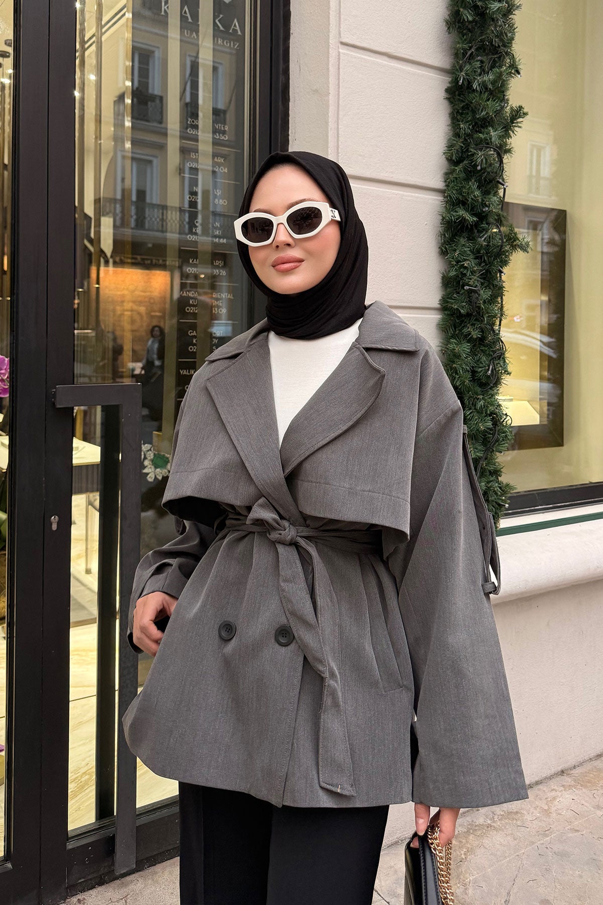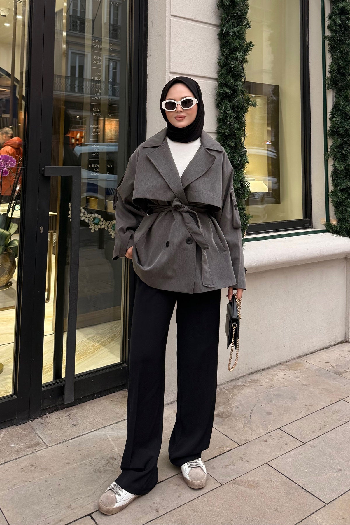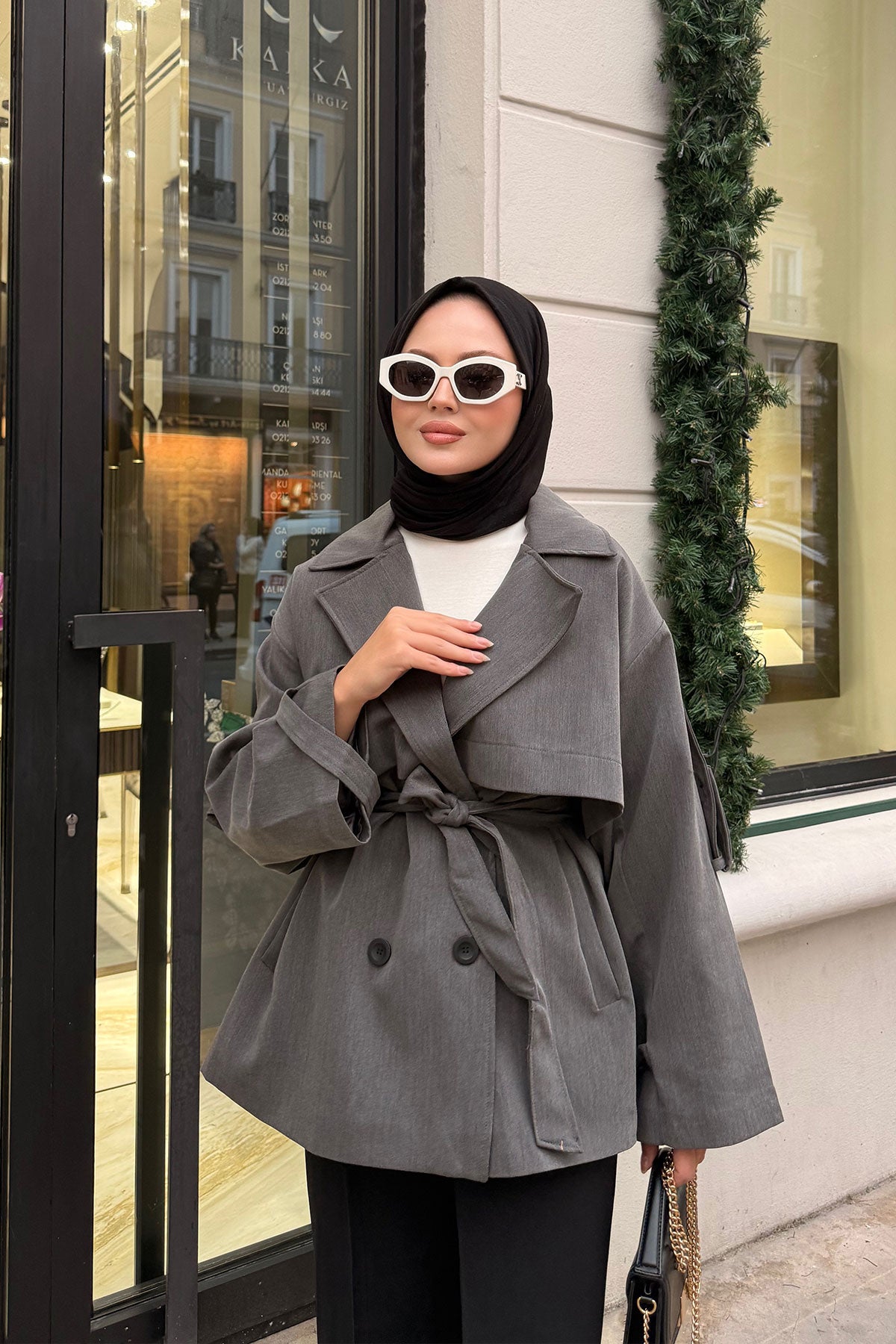 Önü Parça Detaylı Kısa Trenç Antrasit
