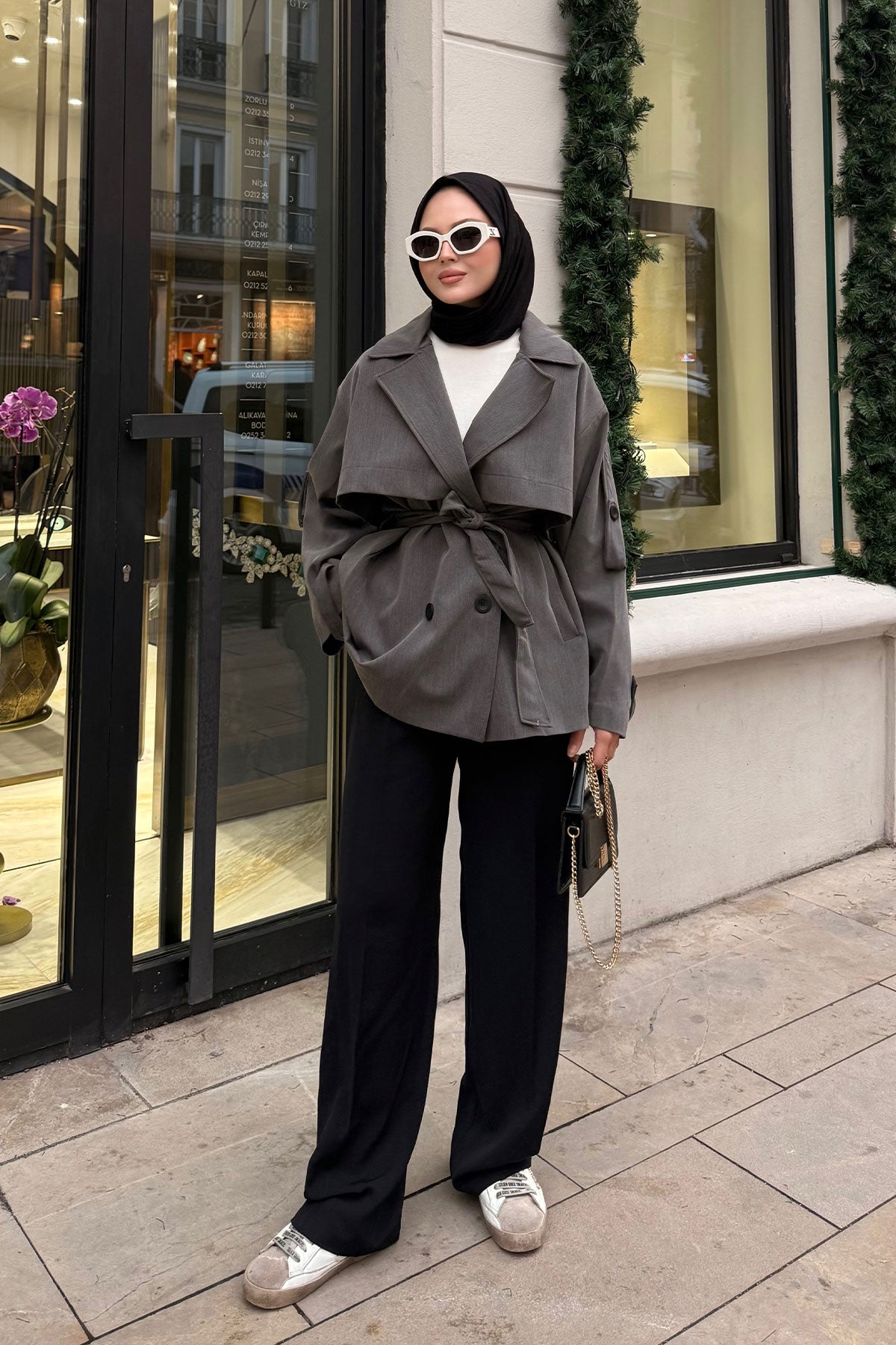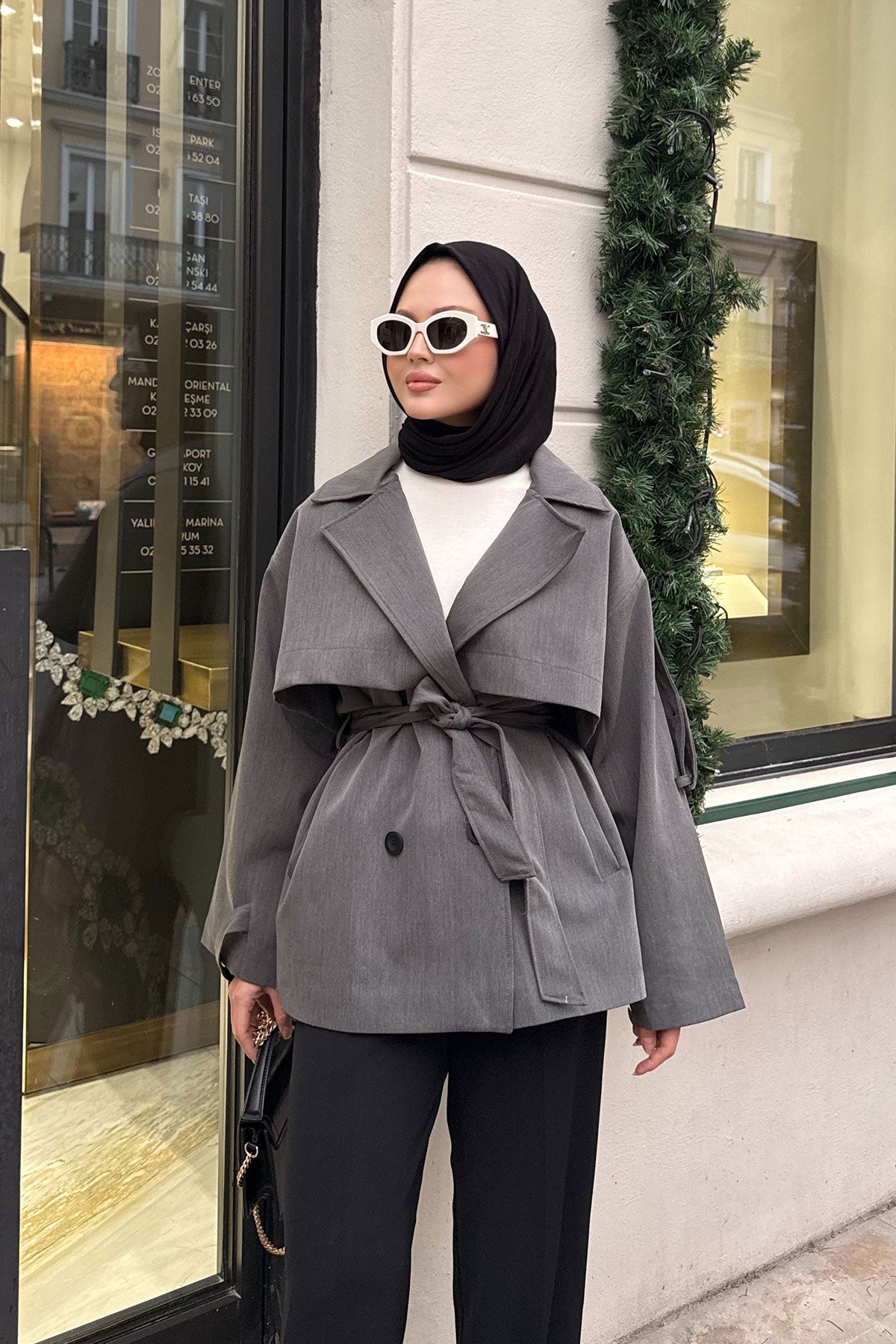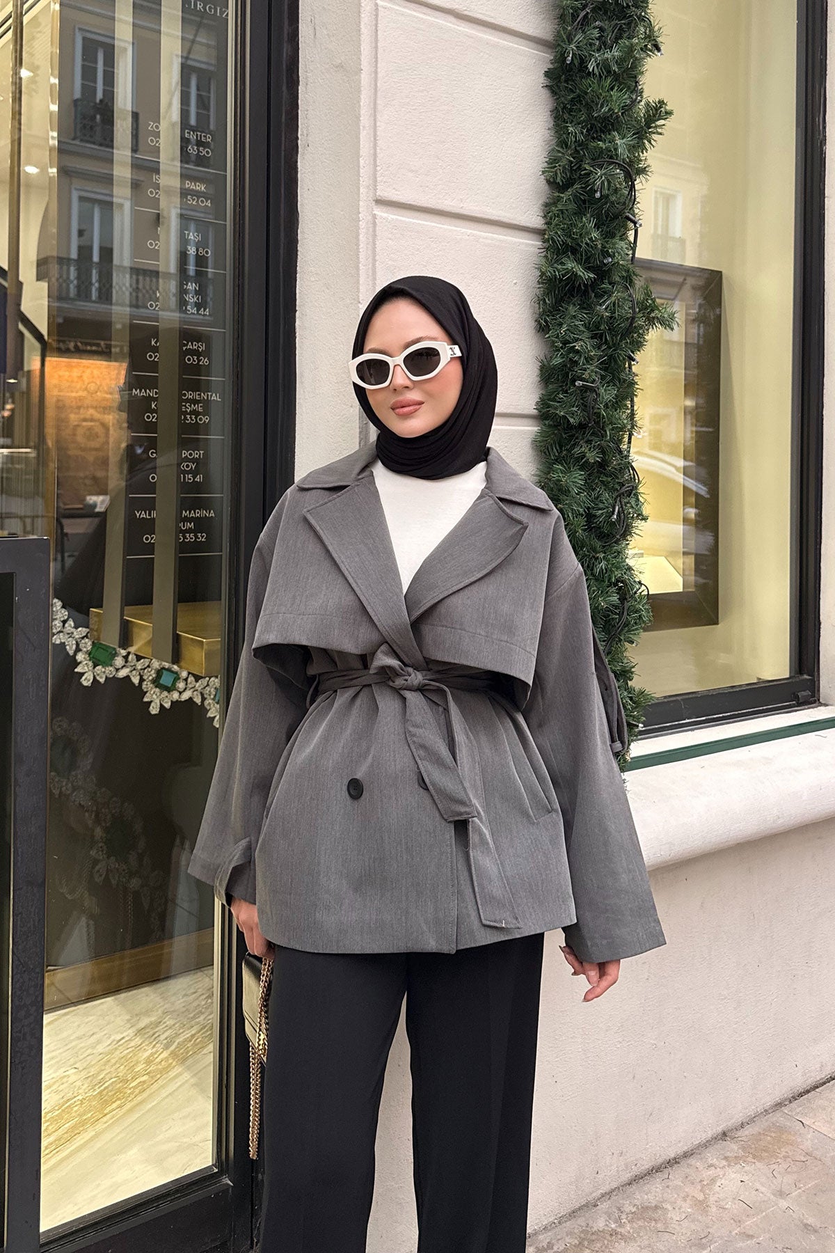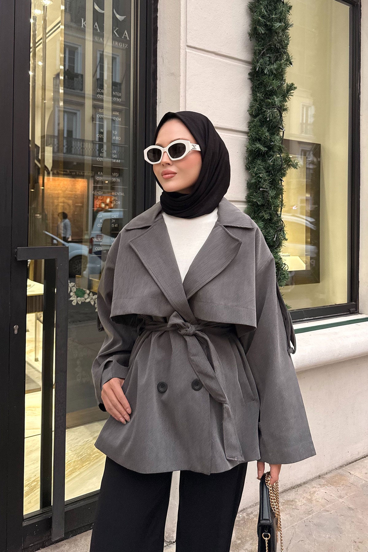 Önü Parça Detaylı Kısa Trenç Antrasit