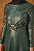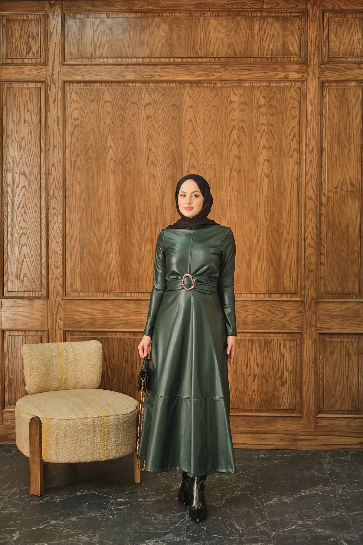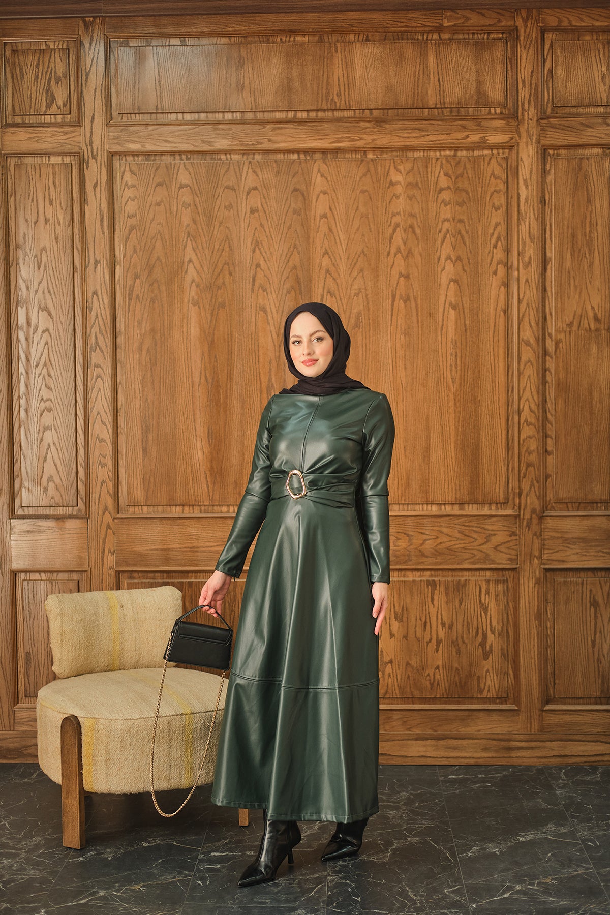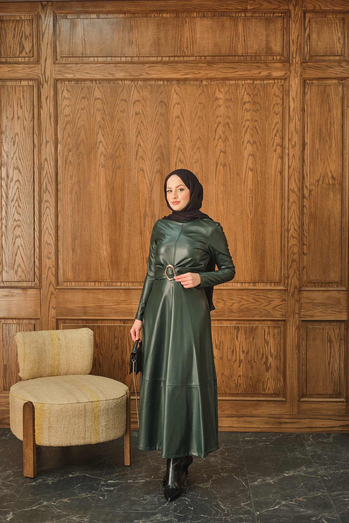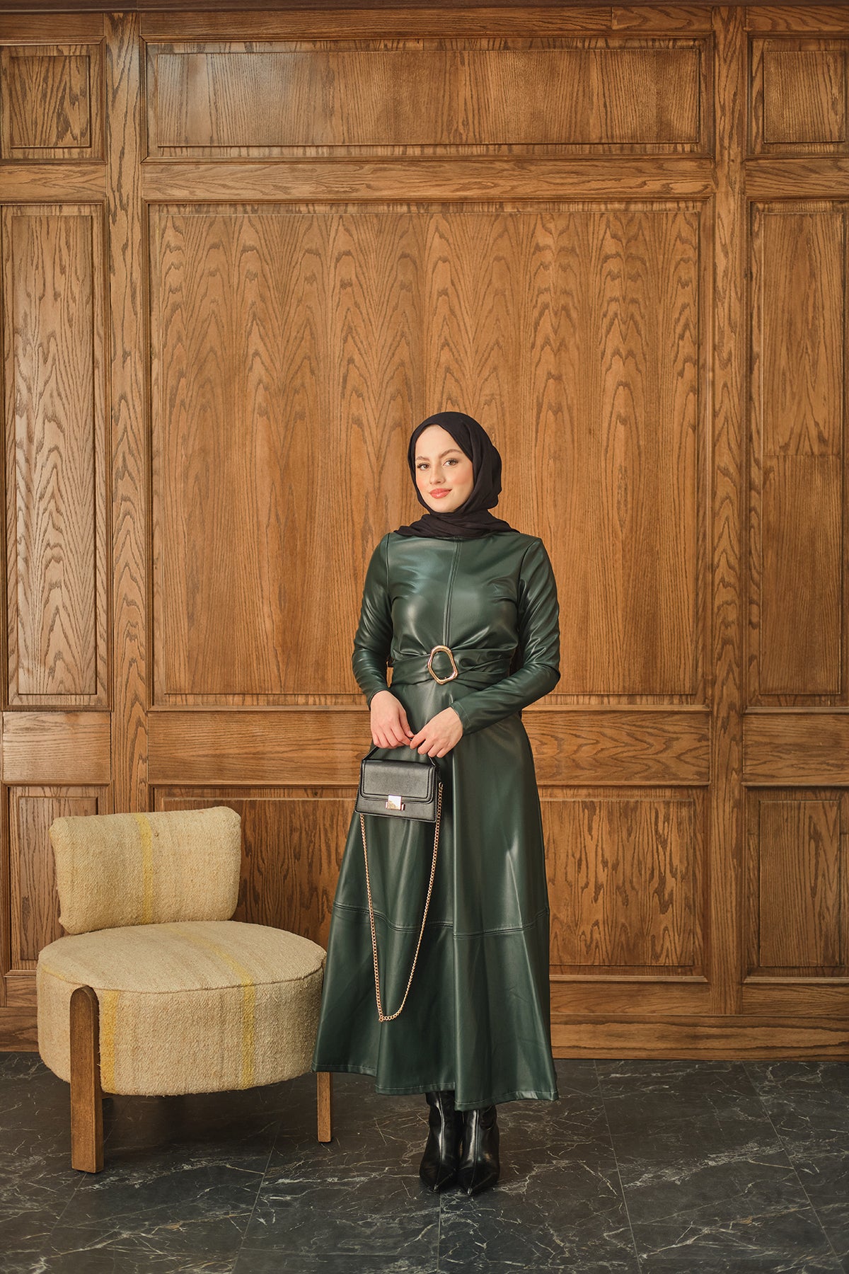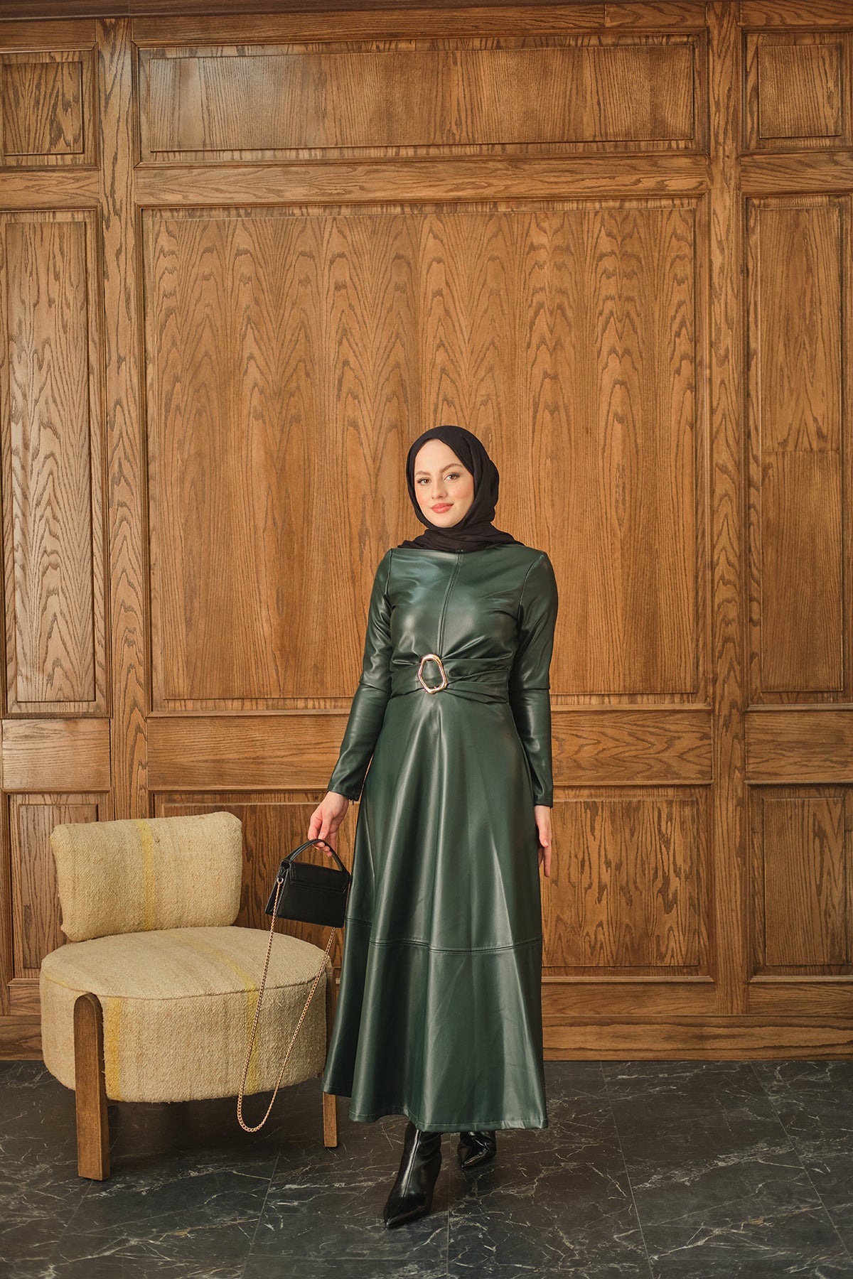 Şardonlu Deri Elbise Zümrüt Yeşil