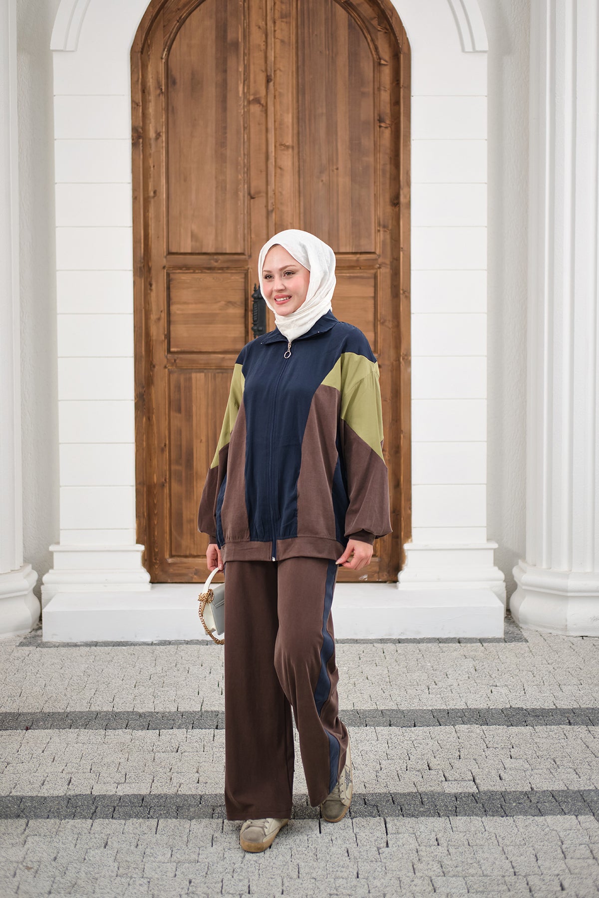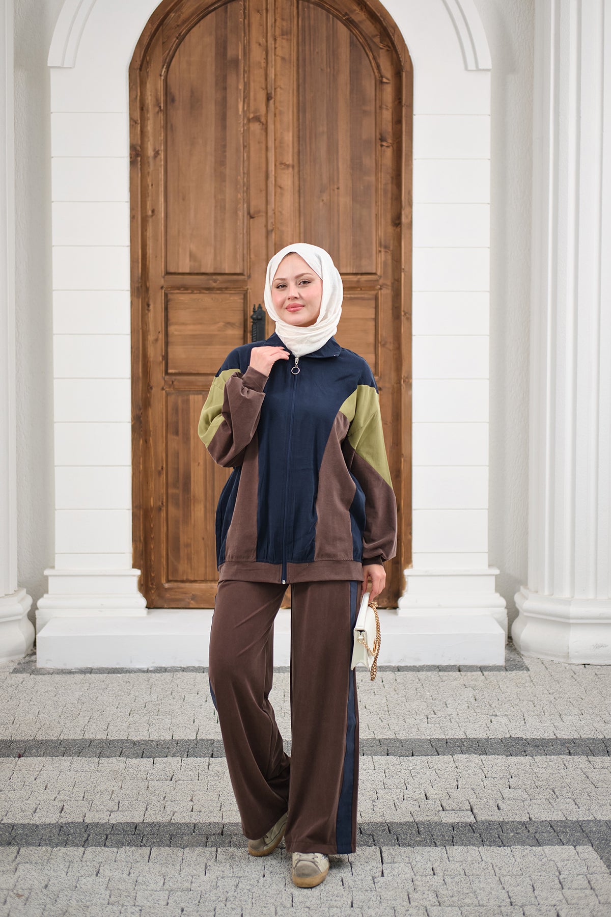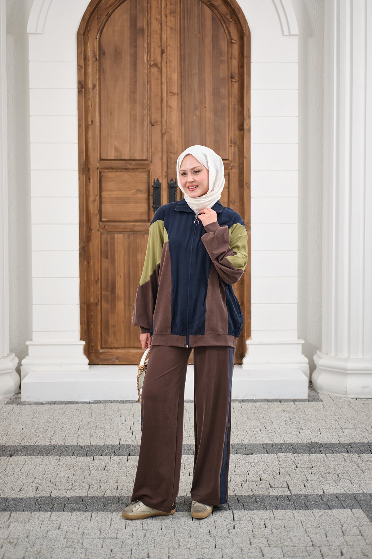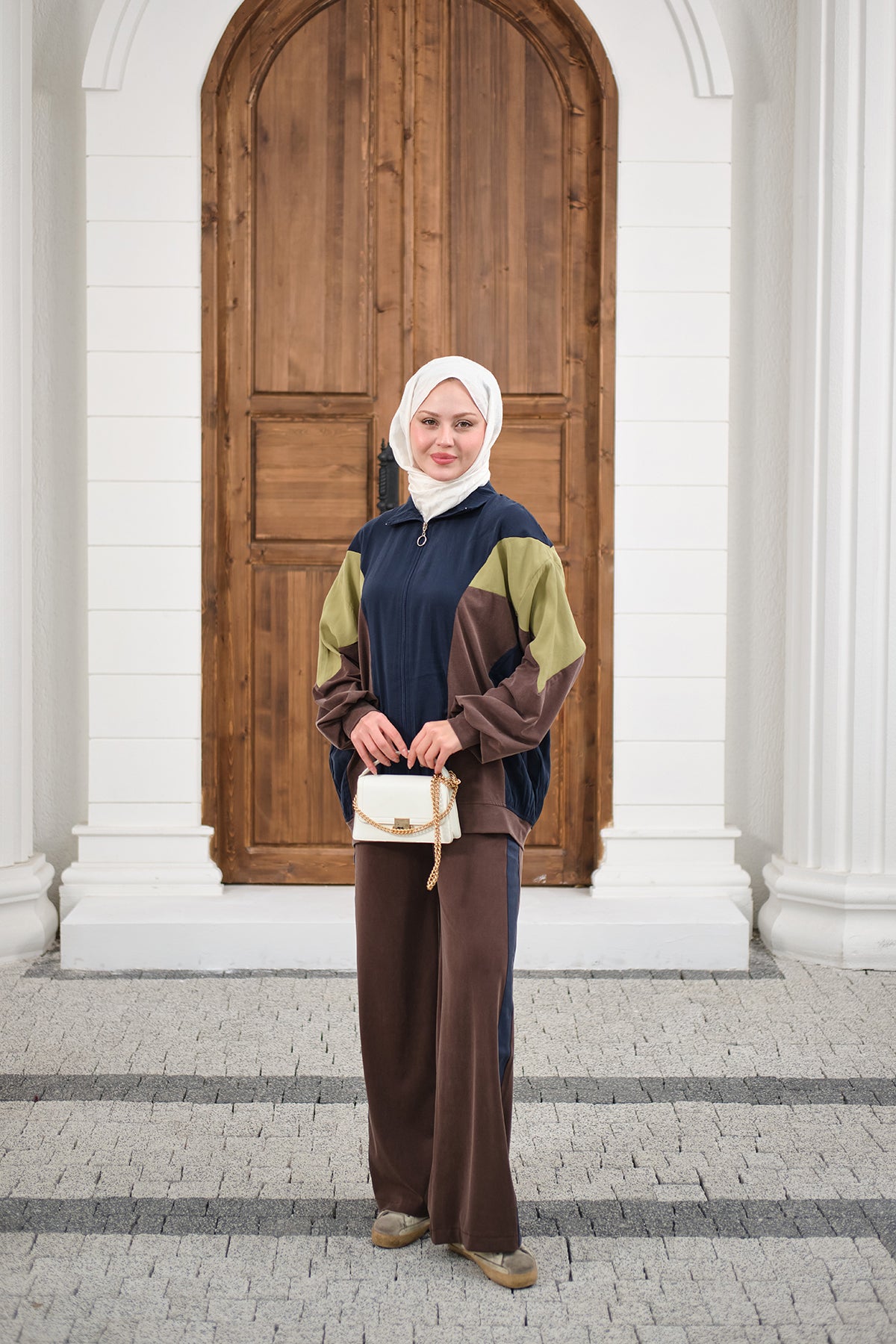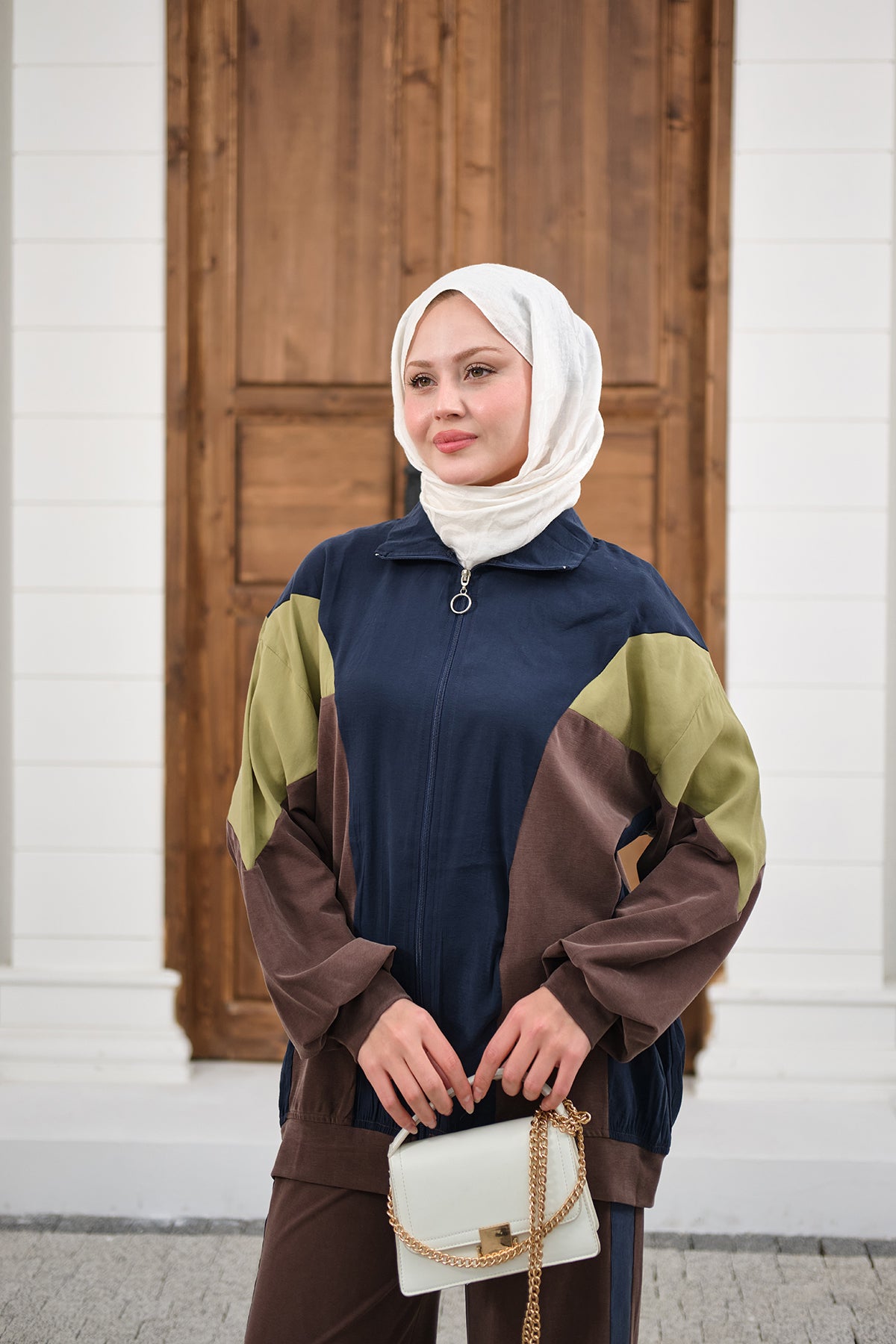 Two-Tone Detail Zip-Up Two-Piece Set - Navy Blue