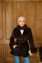 Wool Coat with Fur Trim and Bow Collar - Brown