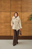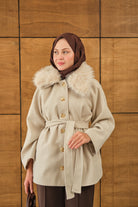 Yaka Kürk Detay Bel Bağlamalı Ceket Krem