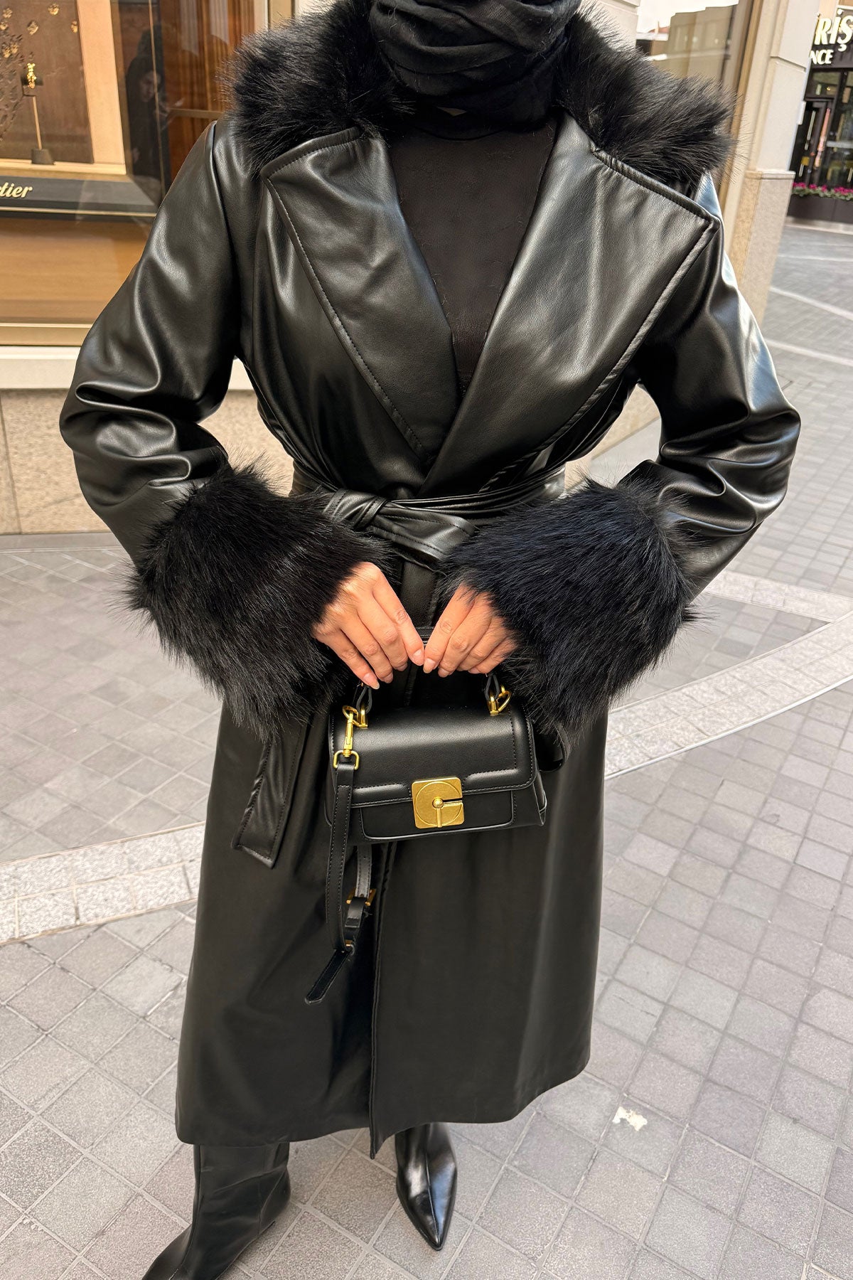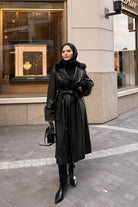 Yaka Kürk Detay Deri Trenç Siyah
